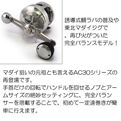 ●유도식 도미 러버의 보급이나 토호쿠 참돔 지그에서,다시 불이 붙었다 완전 밸런스 모델!●참돔 목적(목표)의 원조라고도 말할 수 있는 AC30시리즈의 재등장입니다.손목 만의 회전으로 핸들을 돌릴 수 있는 노브와 암크기의 절묘 셋팅에,완전 밸런서를 탑재 하는 것으로,처음으로 일정속 감음이 간단하게 행할 수 있습니다.