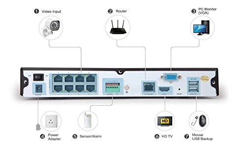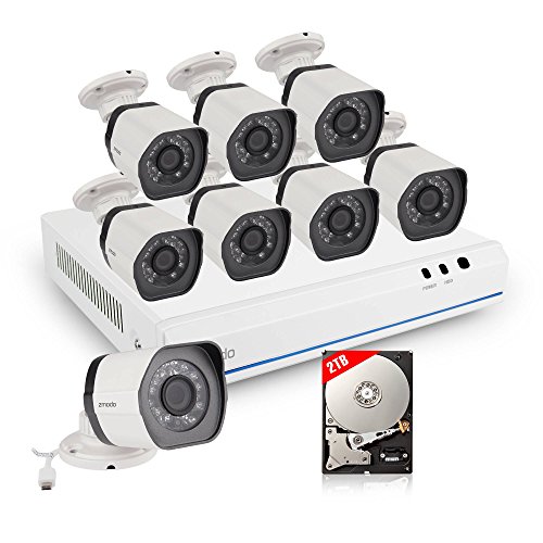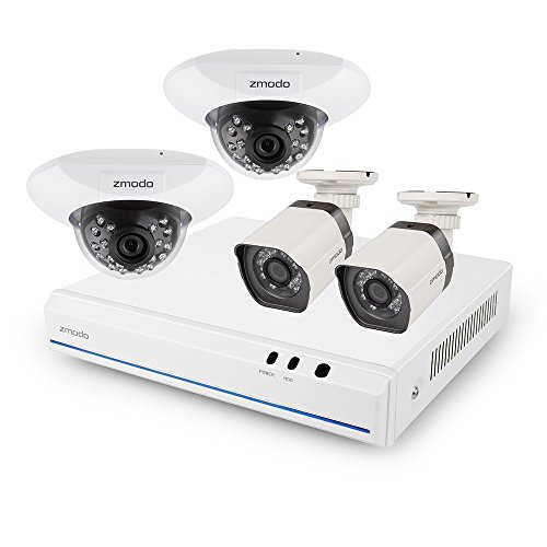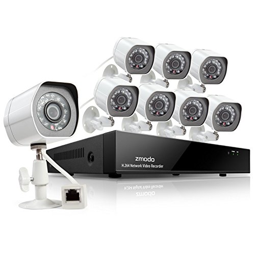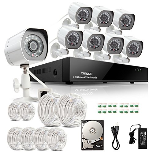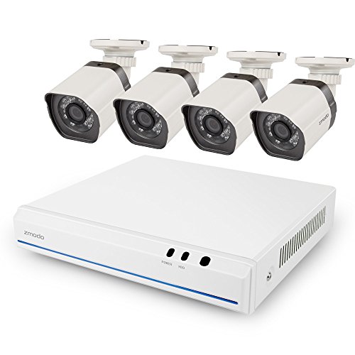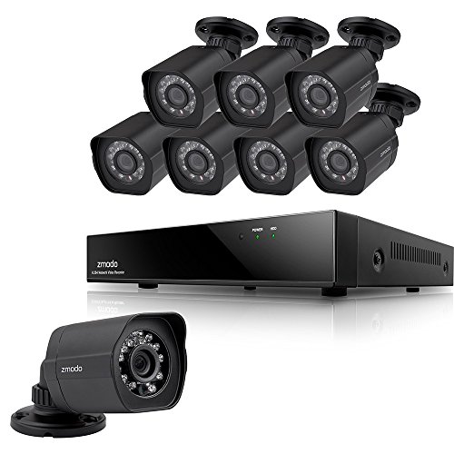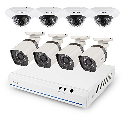 Overview:This Zmodo 8-channel, 8-camera, 1TB hard drive Simplified Power over Ethernet system with digital high-performance video is easier to install then ever before. Only one cable is needed to provide video and power to each camera. Whether it's your home or business, you'll be equipped to have 8 different eyes in the sky keeping watch.Features:720p HD Cameras - With 720p color image sensors and 2.8mm lenses allow you to capture images with 720p HD resolution. IR LEDs provide night vision up to 65'. An automatic day & night mode with IR-CUT filter and auto switch makes it easy to transition between day and night images. 81 Degree diagonal field of view allows you to view a wide area.Free mobile app - Easily access the video on the Zsight app (download required) for connection with select iOS and Android devices, so you can monitor your home or business while you're on the go. The app also has push alert features to send you an alert when the cameras detect motion. Easy web interface - View live video from any web browser at user.meshare.com. Simply log in with the same account information you created on the app, and you can view your cameras on a computer without any port forwarding or IP address hassle.Advanced recording features - Optional intelligent recording mode can save space on your hard drive, recording at fewer frames per second when no motion is detected and at maximum frames per second during motion. This enables you to record longer without ever missing any action.DVR Specifications - 4-channel Simplified POE NVR - Compatible with 3.5” SATA hard drive, expandable to 4TB - DVR supports live view via smartphone (iPhone and Android), tablet, or PC - Motion-activated push notifications, email alerts - Record modes: Normal Record / Intelligent Record / Motion Detection - 1TB hard drive installedCamera Specification - 720p color sensor - 2.8mm lens - 81 Degree viewing angle - Night vision up to 65ftFeature