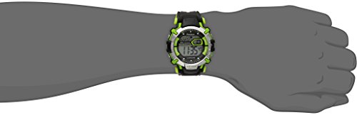 Features buckle closure, chronograph, alarm, lap time, dual time, backlight functions, and LCD display