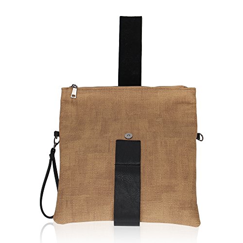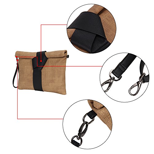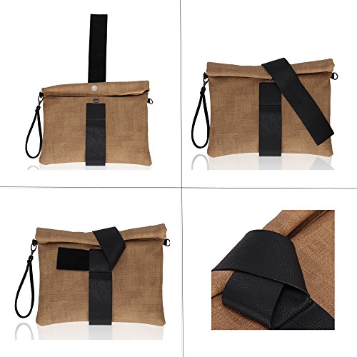 -. Feature : Top Zip Closure / Material: Synthetic Leather & Fabric Lining / Interior features: 1 spacious compartment, 1 zipper pocket, 2 slip pockets / Exterior features: Wrist strap 5.5 inches, Shoulder strap drop 22.6 inches / Approximate Dimension: 11.8L x 12.2H x 0.78W inches