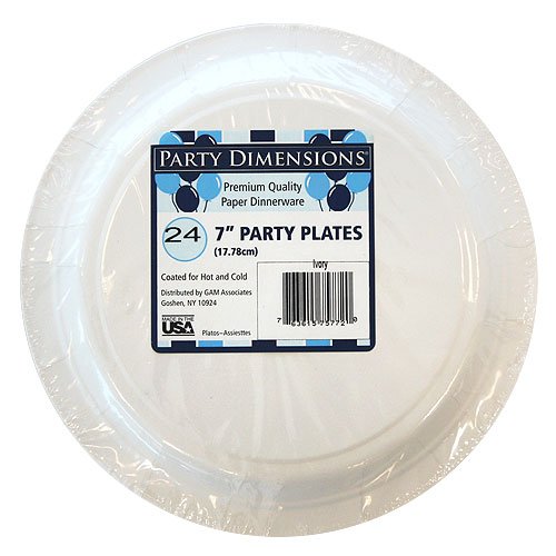 Studio : King Zak Industries, Inc. Publisher : King Zak Industries, Inc. Binding : Kitchen Product Description Party Dimensions 7" Paper Plate, Ivory, 24 Count. This item is part of a set that includes a 9" Plate, a 7" Plate and a 9 oz. Cup. Matching Cutlery and Napkins also available. Comes in 15 colors: White, Ivory, Yellow, Pink, Lime Green, Light Blue, Sunshine Yellow, Island Blue, Red, Orange, Silver, Blue, Hunter Green, Purple and Black. Designed for all occasions, banquets, dinners, parties, upscale catering and home. 0