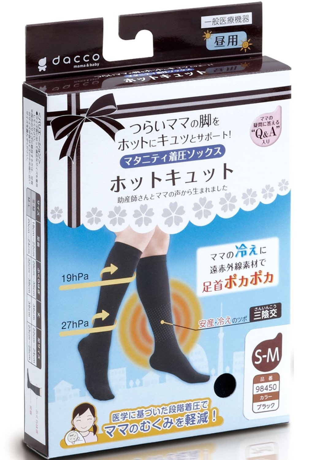 "Dacco (Dakko) Maternity Pressure Sock Hot Cut Lunch Black S-M 1 Foot In" is a maternity pressure sock for day that supports the hard-handed mama's legs hotly.