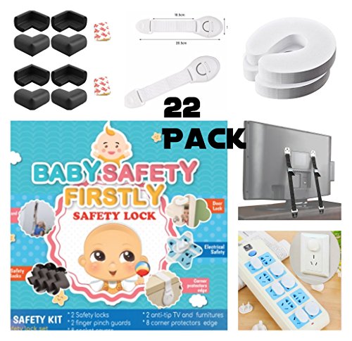 Child Safety Kit | 2 Cabinet Locks 3M Adhesive, 8 Corner Guards, 8 Power Outlet Cover, 2 Finger Pinch Guard, 2 METAL TV Straps | 22 pieces Childproof Set, Easy Installation, All in One for a Safe Home