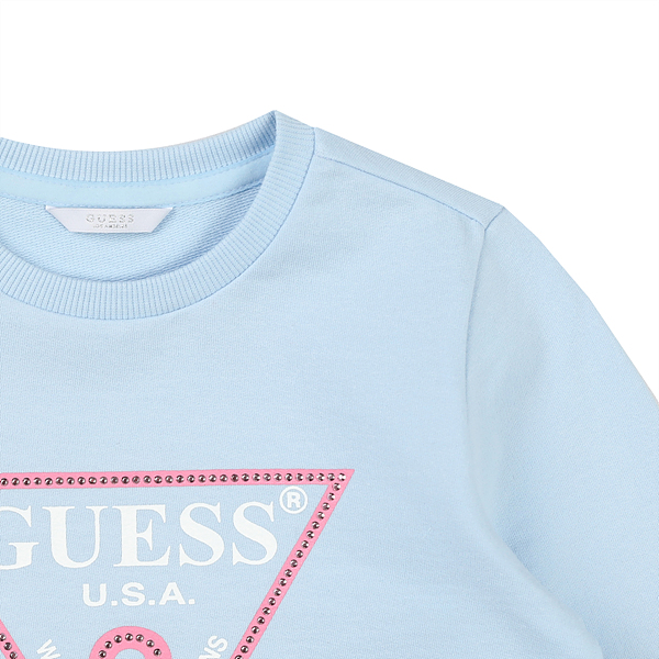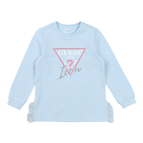 게스 로고에 핫픽스와 스팽글을 얹어 화려함을 더하고 밑단 사이드에 트임과 프릴 디테일로 러블리하게 구성된 아이템입니다.
