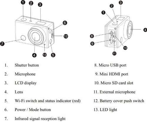 Power Sources:External Lithium battery 1000mAh;Life:1080P 110mins/ 1080P 60mins(Open wifi).