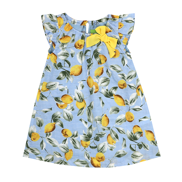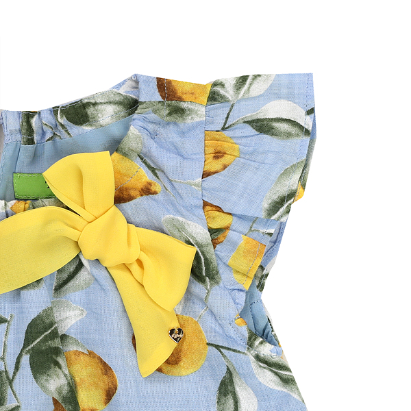 상세설명-시원한 소라 컬러에 레몬나염으로 포인트 되어 귀엽고 상큼한 이미지를 주는 원피스입니다.