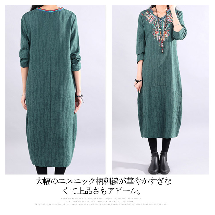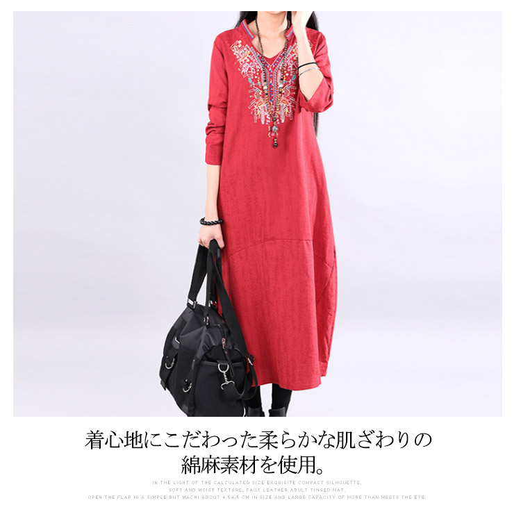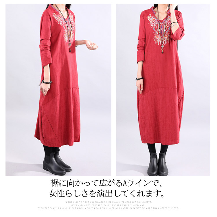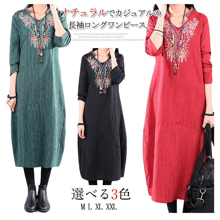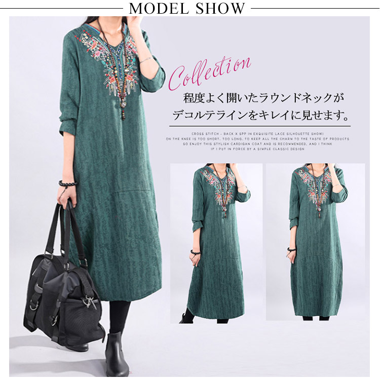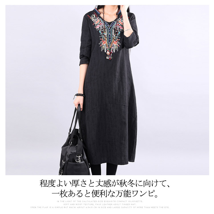 | ナチュラルでカジュアルの長袖ロングワンピース。程度よく開いたラウンドネックがデコルテラインをキレイに見せます。大幅のエスニック柄刺繍が華やかすぎなくて上品さもアピール。着心地にこだわった柔らかな肌ざわりの綿麻素材を使用。裾に向かって広がるAラインで、女性らしさを演出してくれます。程度よい厚さと丈感が秋冬に向けて、一枚あると便利な万能ワンピ。 | |