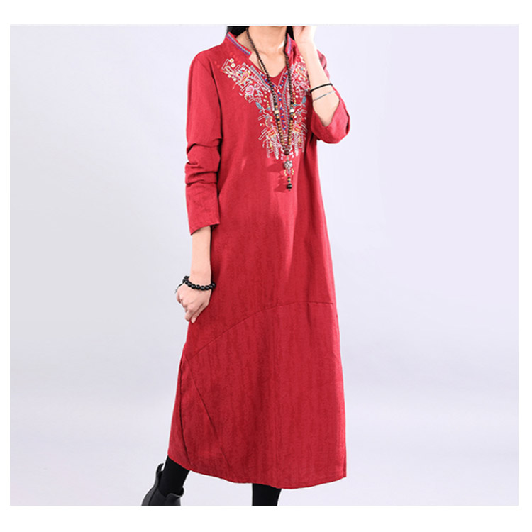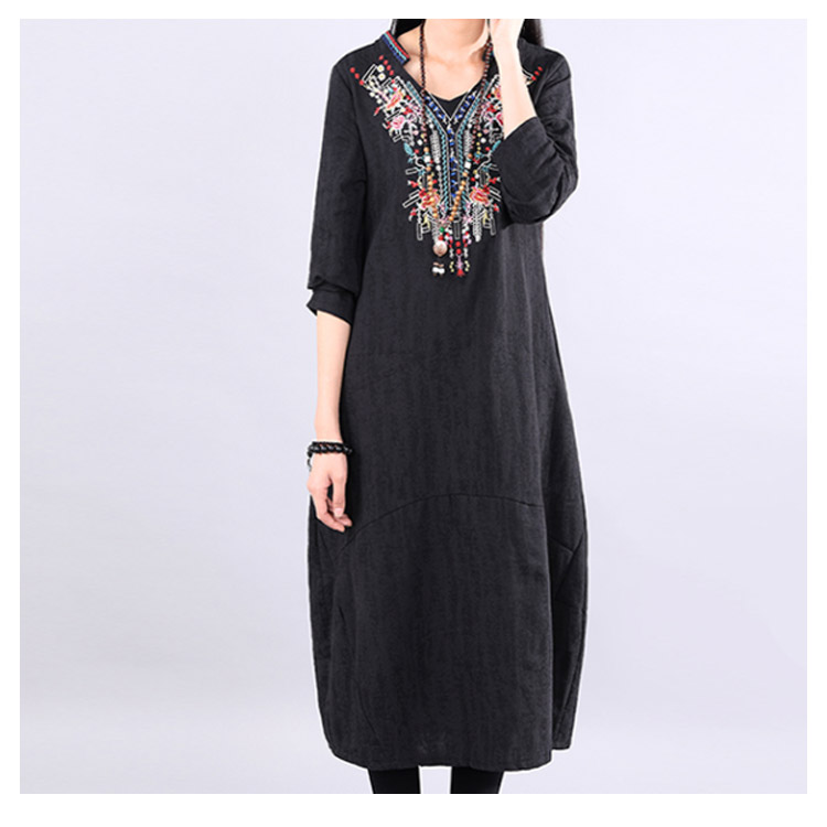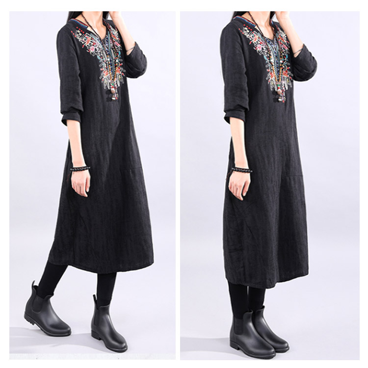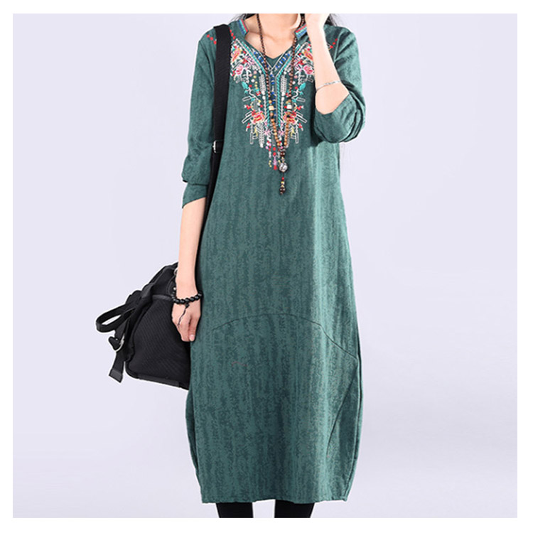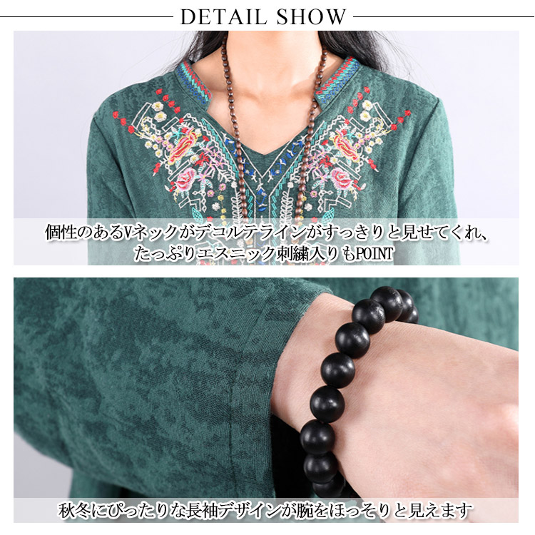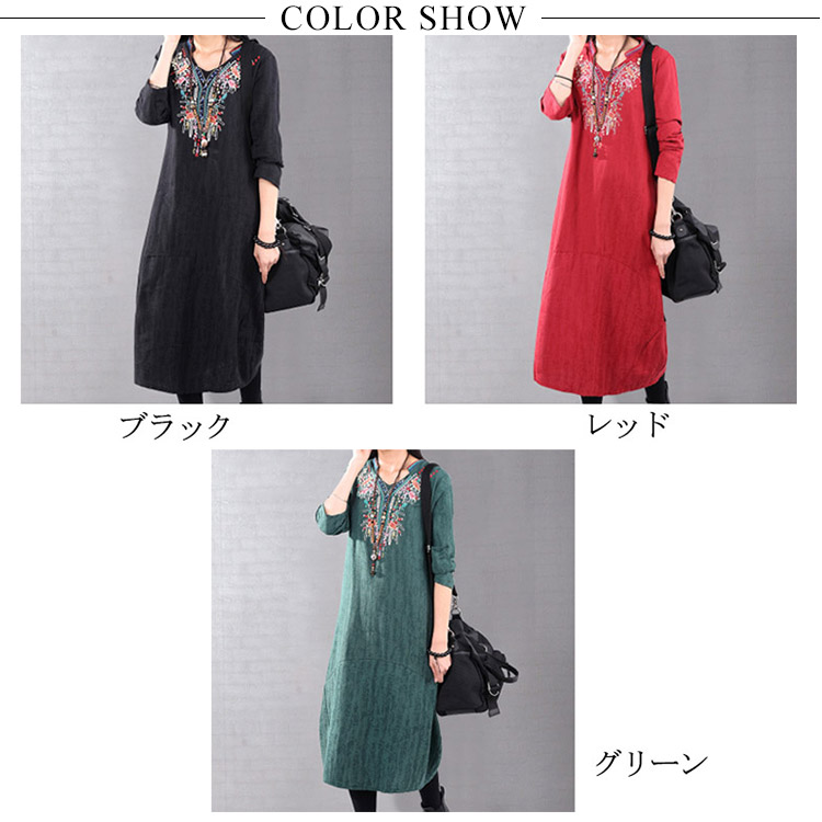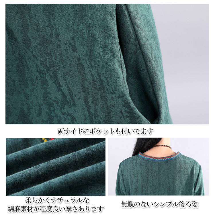 | ナチュラルでカジュアルの長袖ロングワンピース。程度よく開いたラウンドネックがデコルテラインをキレイに見せます。大幅のエスニック柄刺繍が華やかすぎなくて上品さもアピール。着心地にこだわった柔らかな肌ざわりの綿麻素材を使用。裾に向かって広がるAラインで、女性らしさを演出してくれます。程度よい厚さと丈感が秋冬に向けて、一枚あると便利な万能ワンピ。 | |