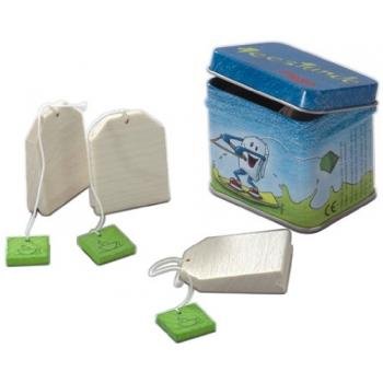 -. Feature : Realistic, interactive pretend play tea bags with string / Recommended for ages 3+ / 4 piece set featuring metal tin for storage