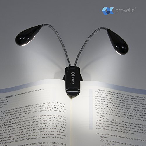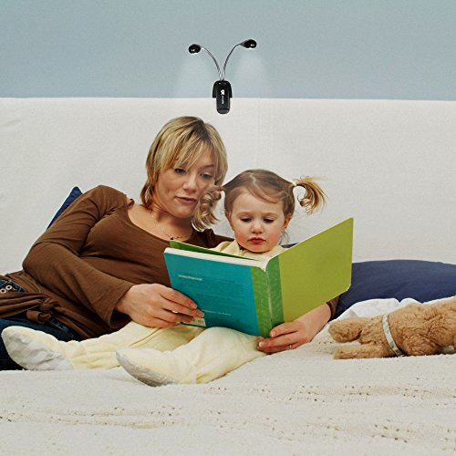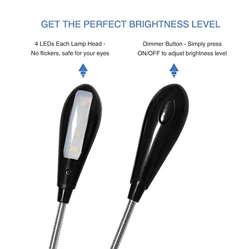 - GET THE PERFECT BRIGHTNESS LEVEL: Dim and brighten these 8 mini LEDs with a single click. Choose your most comfortable brightness level out of FOUR SETTINGS. It’s flicker-safe, hotspot-free, and is perfectly safe for your eyes. And its dual-head design distributes light evenly across both pages.