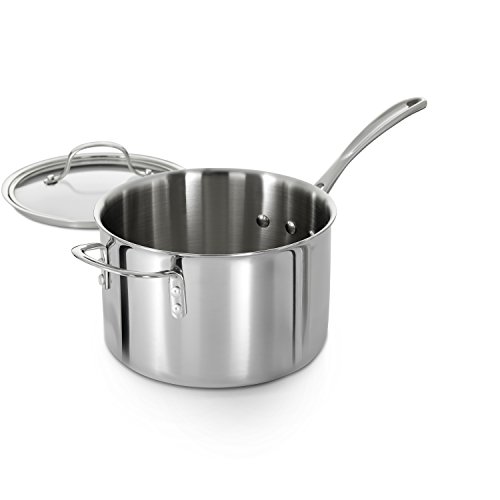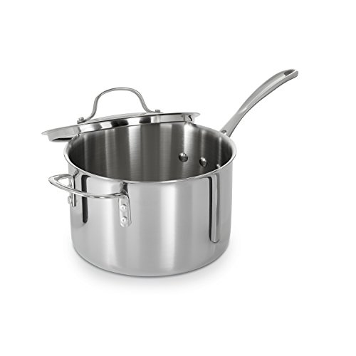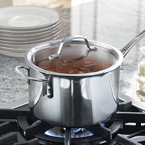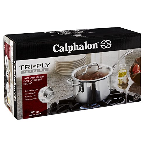 Tri-Ply stainless combines the even heating of lightweight aluminum with the durability and corrosion-resistance of steel in an elegant design. Aluminum core between 2 stainless steel layers provides even heating for excellent browning and control of the cooking process. Non-porous stainless steel cooking surface is safe for use with all utensils. Elegant brushed stainless steel exterior can go from the oven or stove directly to the table. Reflective cook surface makes it easy to monitor foods as they cook and remains beautiful over time. Clear tempered-glass lids let you see food while it's cooking and are oven safe, so you can finish covered dishes in the oven or keep them warm until ready to serve High sides and narrow opening minimize evaporation during slow process of stock- and soup-making. Heavy-gauge sloped bottom heats evenly makes stirring easier. Long, brushed stainless steel handles stay cool on the stovetop. All cookware is dishwasher-safe and carries Calphalon's full lifetime warranty.