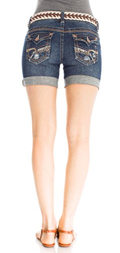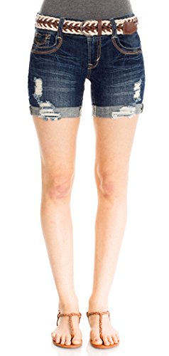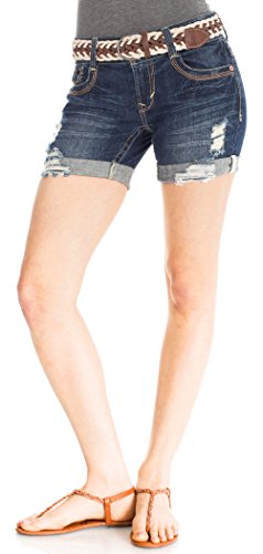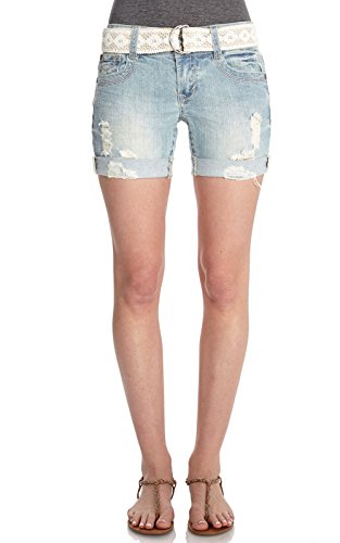 Mid thigh denim shorts featuring light destruction, a rolled cuff, and a removable woven belt.