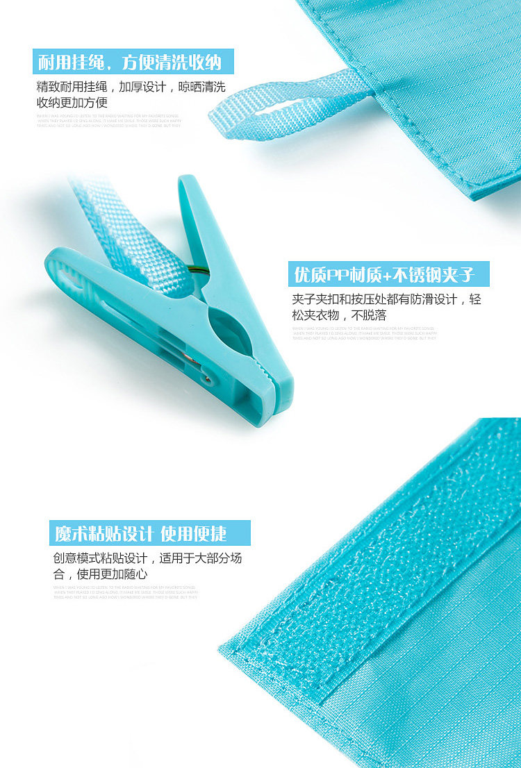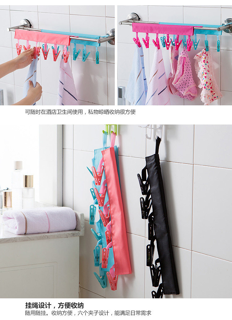 介绍:6个强力夹子组合,扩大原有晾晒空间,魔术贴设计,可