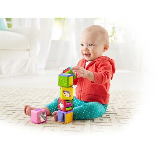 Each block has a fun feature: a flipper, roller, squeaker, rattle beads, mirror and touchy-feely textures!