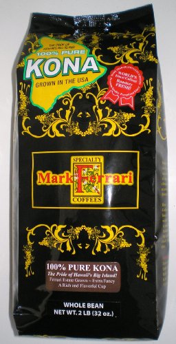 -. Binding : Misc. -. Brand : Mark Ferrari Specialty Coffees -. EAN : 0897494000285 -. Feature : 100% Kona Coffee... The P.R.Ide of Hawaii's Big Island! / Family Owned Kona Coffee Farm since 1980 / Grown on the Big Island of Hawaii's Kona Region, USA! / Roastery Fresh/Small Batch Artisan Roaster (28 years experience) / Premium Quality, Incredible Depth of Flavor and Aroma -. Label : Mark Ferrari Specialty Coffees -. LegalDisclaimer : Dear customers please note we use the same preP.R.Inted bag for all our coffee varieties. We simply apply a label over-top that correctly identifies the coffee style being packaged. This is a common practice for small gourmet food manufacturers. -. Manufacturer : Mark Ferrari Specialty Coffees -. MPN : 9853 -. PackageQuantity : 1 -. PartNumber : 9853 -. ProductGroup : Grocery -. ProductTypeName : GROCERY -. Publisher : Mark Ferrari Specialty Coffees -. Size : 2 LB (32 oz.) -. Studio : Mark Ferrari Specialty Coffees -. Title : 100% Pure Kona Coffee-Medium-Dark Roast Whole Bean, 2 LB Bag -. UPC : 897494000285