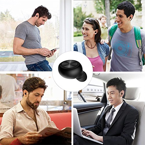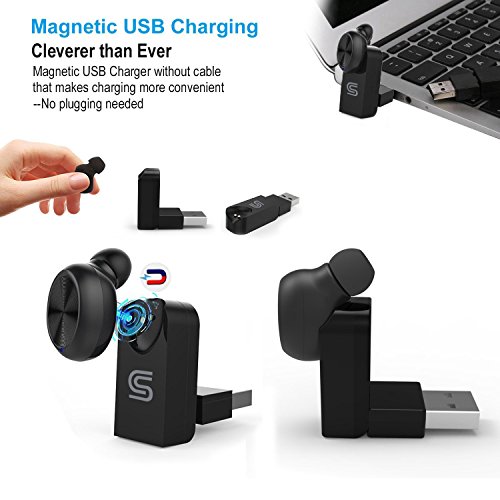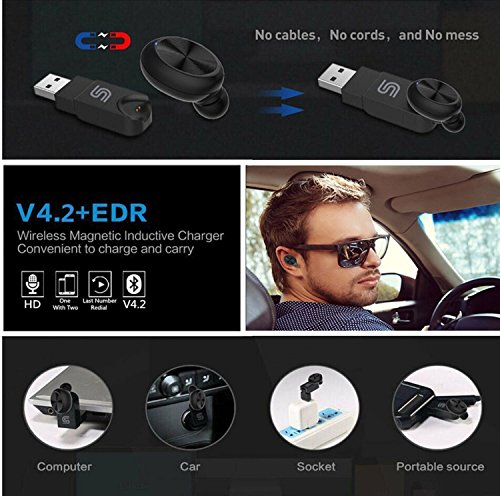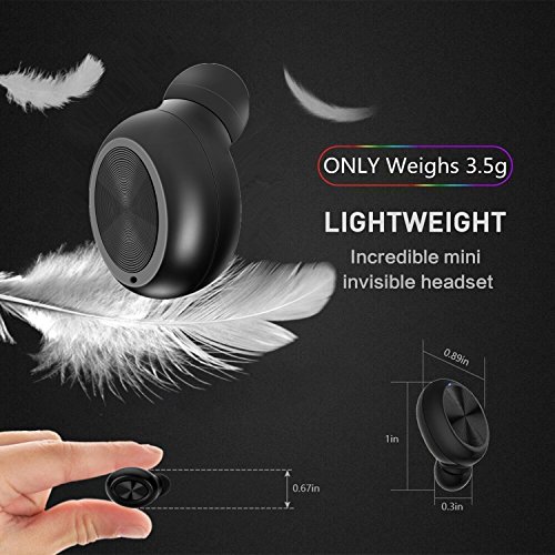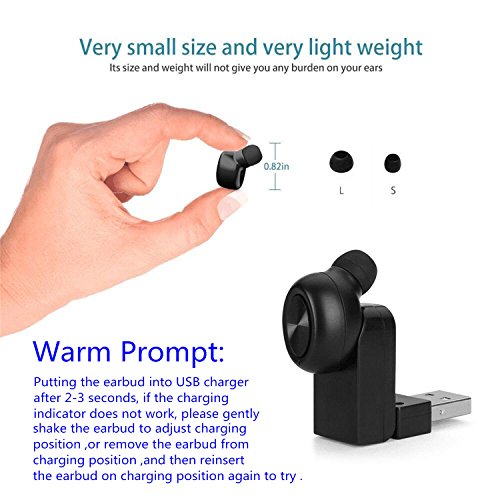-. Feature : ABSOLUTELY WIRELESS BLUETOOTH EARBUD EARPHONE WITH NO CHARGING CABLE: Coming with a magnetic USB charger which is easy to be adjusted up to 90 degrees to charge through the power bank, computer or car. Special wireless charger lets you charge the headset anytime anywhere; / OUTSTANDING BATTERY LIFE: Wireless Headphone with outstanding battery life built in 60mAh lithium-ion polymer battery, up to 4-5 hours talking time or 4-5 hours music time on a full charge; / SUPER SMALL INVISIBLE EARBUD AND EASY TO USE: Mini Invisible wireless earbud earpiece, compact and lightweight; One Button Design Easy to control; / COMFORTABLE AND STABLE WEARING: Equipped with 2 pcs soft silicone ear plugs (Large,Small),the bluetooth earbud perfectly fits all types of ear canals. Hidden indicator, no more annoying. / GREAT COMPATIBILITY: This bluetooth earpiece easy to pair with most Bluetooth-enabled devices: for Smartphones (iPhone 7, Samsung S7...) and tablets (iPad, Kindle Fire...), could connect 2 smartphones at the same time and answer calls from either one.