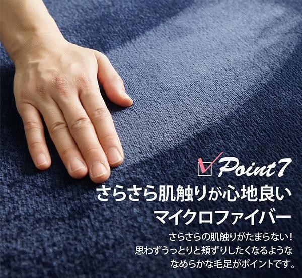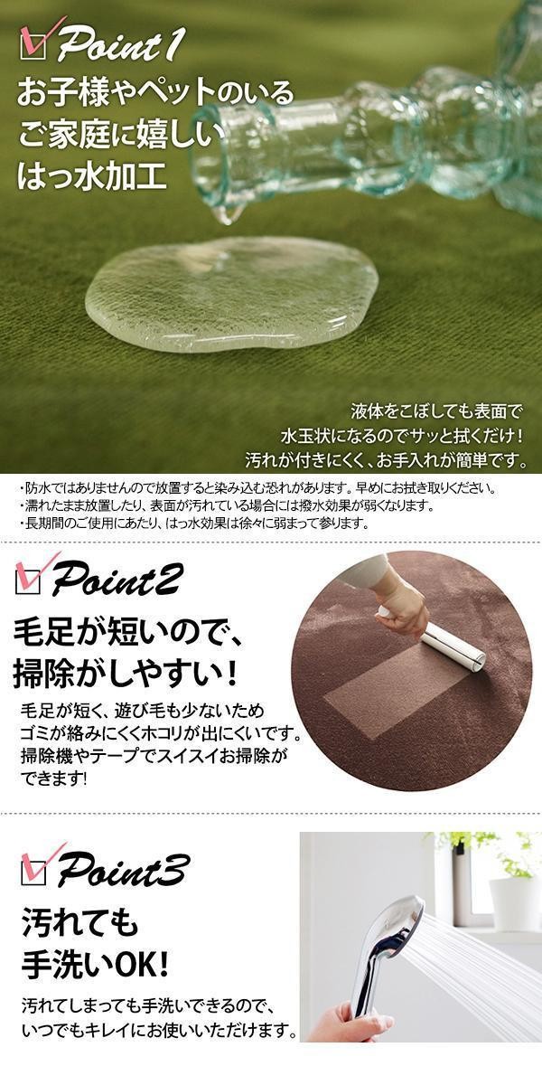 オールシーズン使える、はっ水&低反発の多機能ラグです。汚れが付きにくく遊び毛が出にくい。さらに手洗い可能なのでペットがいるおうちでも気軽に使っていただけます♪耐熱加工を施しているので、ホットカーペット・床暖房にも対応しています。優しいさらふわ手触り☆ |