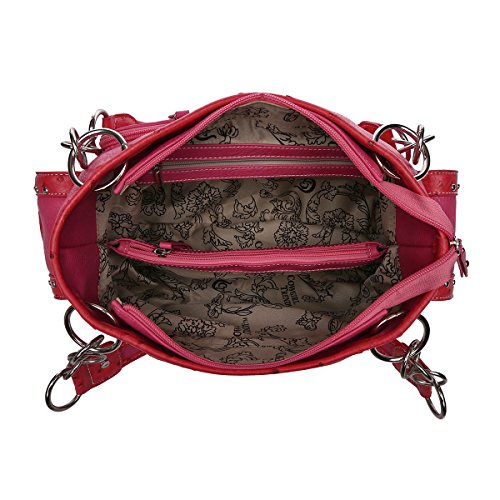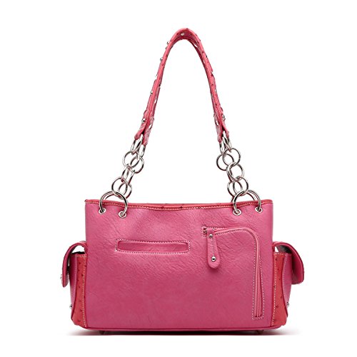 Dual lined interior with a zip pouch divider that makes it 3-way compartment. Adding to it is an inner zip pocket and two magnetic-lock side pockets. At the back of this purse are the conceal carry pocket and a slip pocket next to it.