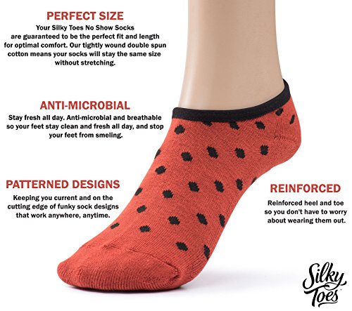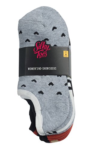 -. Binding : Apparel -. Brand : Silky Toes -. Department : womens -. Feature : NO SHOW- Socks are meant to give you the comfort of wearing footwear. These No Show socks achieve both. You get to experience the comfort, and your socks stay hidden underneath the stylish footwear you want to show. / COMFORT- ComP.R.Ised of 95% Super Soft Polyester these No Show Socks will keep you Sweat Free All Day! / STYLE - With a variety of P.R.Ints and colors to choose from these socks offer the perfect variation for every wardrobe and occasion. / DURABILITY- Wear and Wash. Easy Care. Tumble Dry. -. IsAdultProduct : 0 -. ProductGroup : Apparel -. ProductTypeName : SOCKSHOSIERY -. Title : Women's No Show Socks Patterned Cushioned Foot Liners 6 Per Pack By Silky Toes