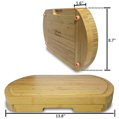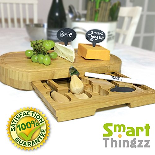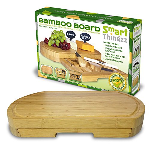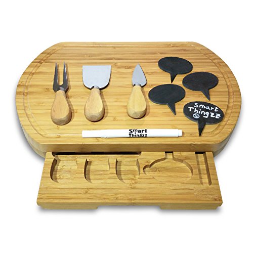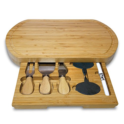 All-In-One 9 Pieces Bamboo Wood Cheese Board Set With A Slide Out Tray. This Top Quality Bamboo Cutting Board Comes With A Set Of 3 Cheese Slicer Knives, 4 Natural Slate Labels and More