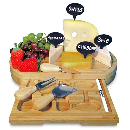 - 100% NATURAL BAMBOO 9 PIECE CHEESE BOARD SET: Serve Cheese Like A Master Chef. Our cheese cutting board would make your guests’ heads turn at this classy natural bamboo, oval shaped cheese board tray and serve cheese in style at your next dinner party! Our premium wooden cutting board is a must-have ALL-INCLUSIVE cheese serving set that guarantees classy cheese slicing and chopping for any novice or seasoned cook! Perfect Choice For Housewarming Parties.