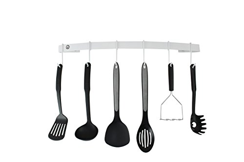 Kitchen organizer measures 24 inches long by 5 inches wide by 3 inches high; includes 6 straight pot hooks and drywall toggles