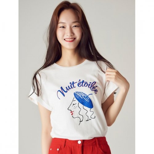 ● 턴업된 슬리브리스 디자인에 우븐 우먼 드로잉 디테일로 포인트를 준 티셔츠.