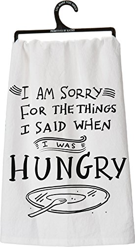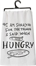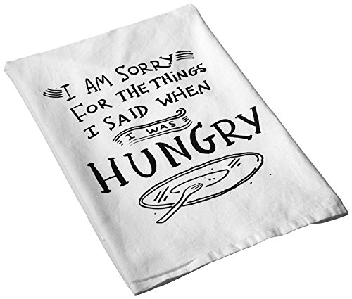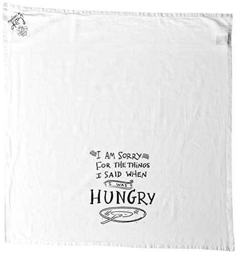 Product Description I am sorry for the things I said when I was hungry. This fun message decorates a pretty white flour sack towel. Measures 28" x 28". 0