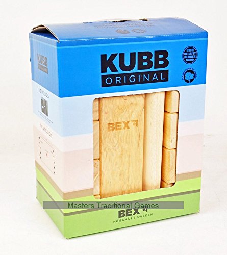 The Original Kubb Game (koob) is made of sustainable, plantation grown, 100% hardwood. It is a well known lawn and beach game not only in Sweden, but throughout Europe. Best lawn, party, beach, camp game ever! QUALITY SOLID HARDWOOD CONSTRUCTION: BexSport Kubb Games are constructed of durable hardwood not pine for superior play. 16 LBS. WEIGHT: Special attention is given during manufacturing to ensure properly weighted pieces. Extra long corner stakes to mark your field. This long lasting Kubb game will bring your family and friends years of enjoyment! Box Contains 1 pc King 6 pcs Throwing Sticks 10 pcs Knights 4 pcs Area markers 1 pc Carrying Bag Rule book in 7 languages. This long lasting Kubb game will bring your family and friends years of enjoyment! Box Contains 1 pc King 6 pcs Throwing Sticks 10 pcs Knights 4 pcs Area markers 1 pc Carrying Bag Rule Book