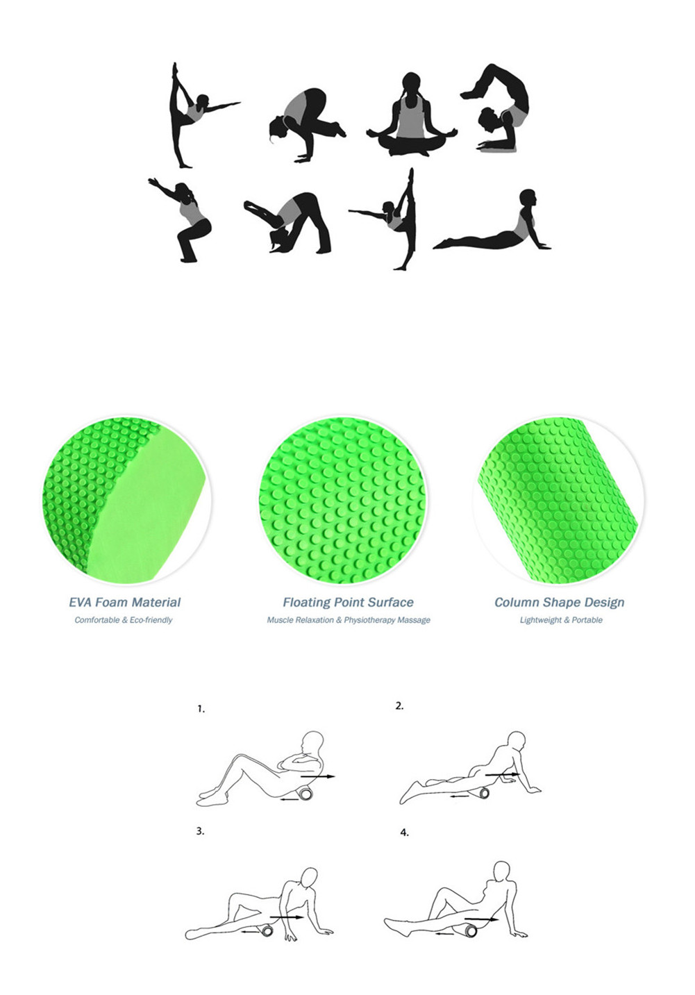 Foam roller is crossover equipment from rehab training. It's lightweight and versatile, making it an ideal tool for home workout or studio. Very simple pieces of equipment (nothing more than a cylinder made of high-density foam), EVA Floating Point Yoga Foam Roller is put to all kinds of uses, such as stretching, self-massage, body support, and stability exercises.