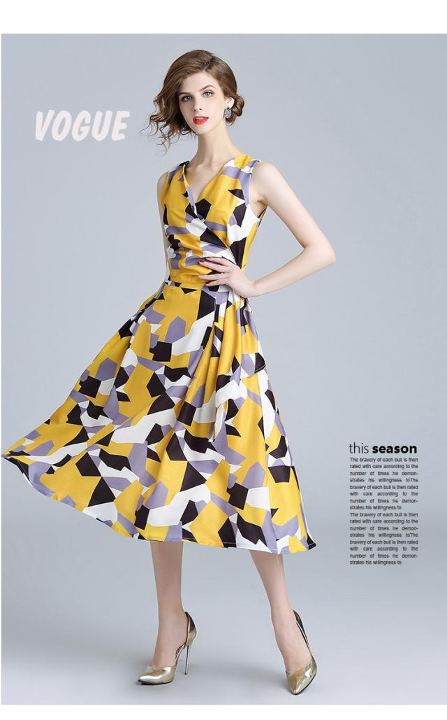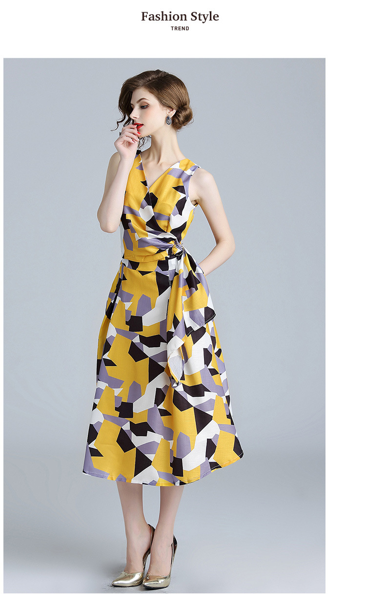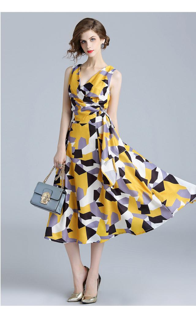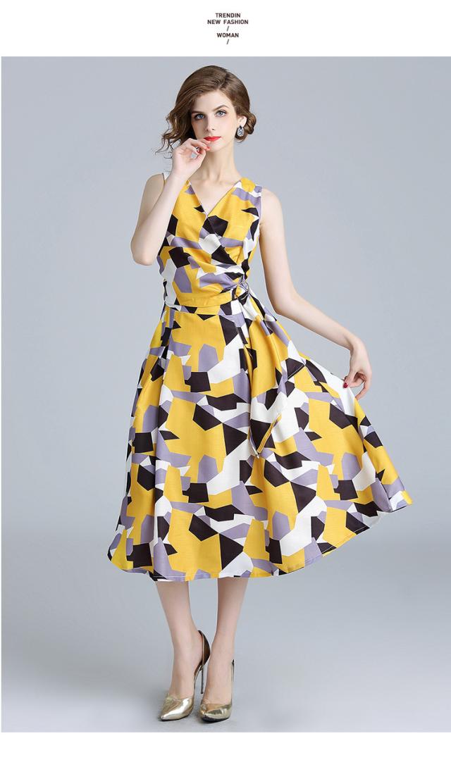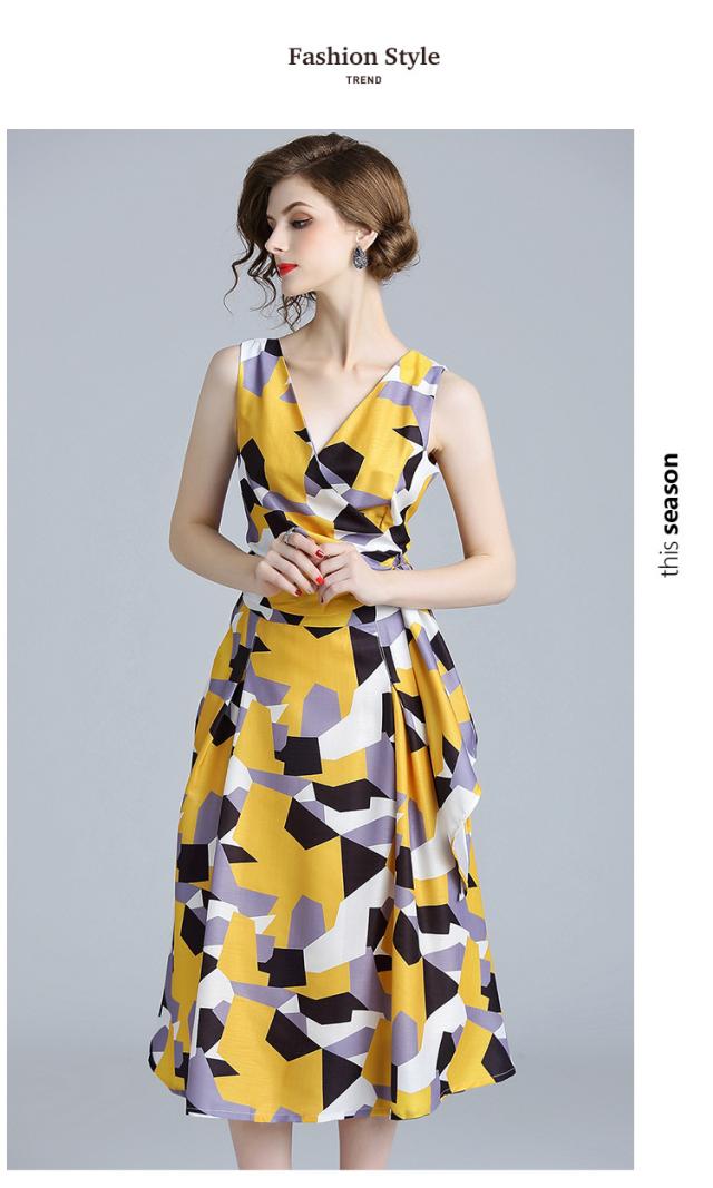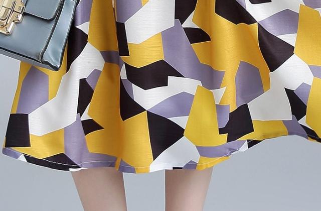 シンプルな幾何柄とフィットアンドフレアシルエットは大人のイメージに。