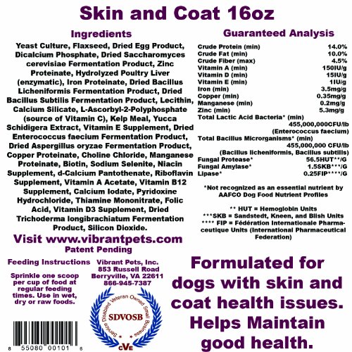 Use Vibrant Pets Skin & Coat for your pet's overall health and vibrant skin and coat. Creates a shiny coat and healthy skin. Increases hair growth, reduces excessive shedding. Alleviates itchy skin. Increases digestion and allows more nutrient absorption. Reduces sensitive stomach issues and enhances the immune system.