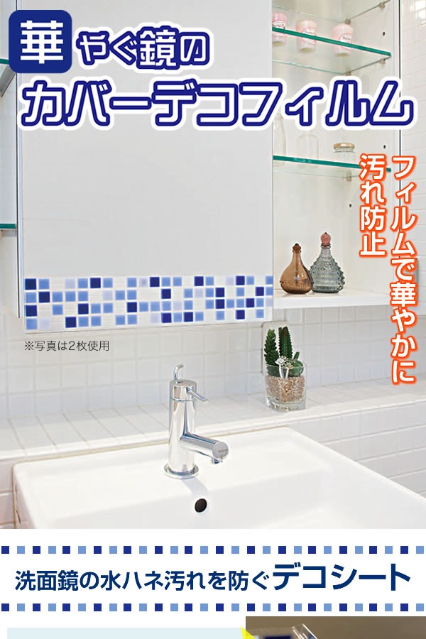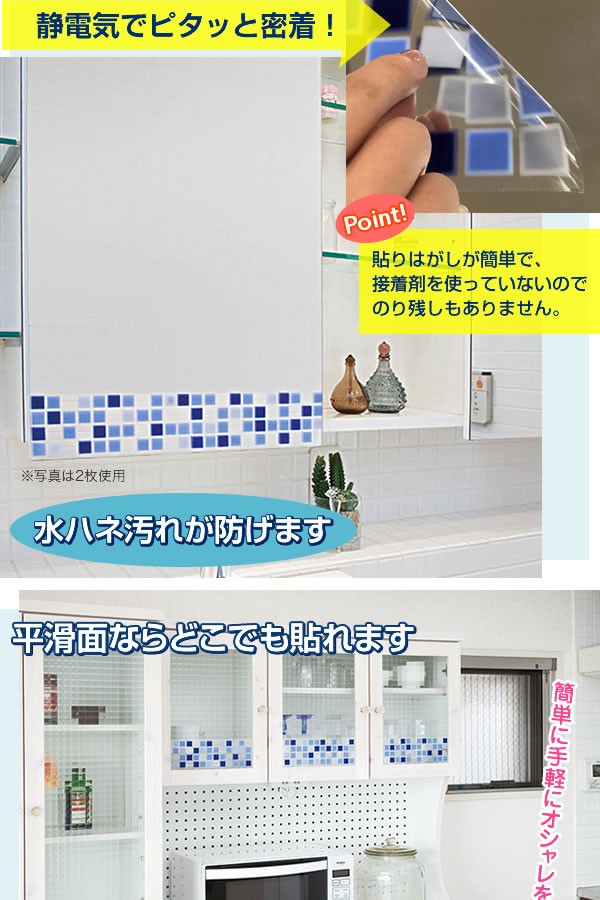 <h1>鏡や室内のガラスなど平滑面に粘着剤無で貼れる汚れを目立たせにくいフィルム。オシャレに汚れを目立たなくさせ、簡単に取り外せるフィルムです。鏡デコ/汚れ防止フィルム/デコフィルム/粘着剤無し/鏡に貼るシート/静電気で貼る/ガラスに貼る/モザイクタイル柄/防汚フィルム</h1>