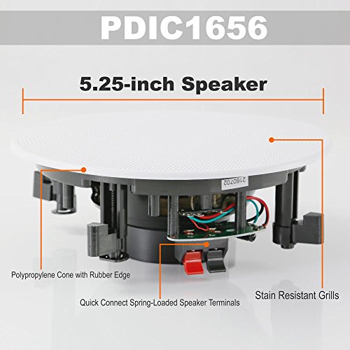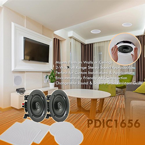 -. Binding : Electronics -. Brand : Pyle -. Color : White -. EAN : 0068888770392 -. Feature : SEAMLESS INTEGRATION - Perfect for existing home theater systems this Pyle 2-way in-ceiling or in-wall speaker system delivers incredible stereo sound to any room in your home from speakers you can barely see without using any floor or shelf space / EASY TO INSTALL - Includes a cut-out size template and quick connect sP.R.Ing-loaded speaker terminals for simple, easy, no hassle installation, in any room, delivering a full rich sound without cluttering floor space / CHANGEABLE GRILLS - Includes a pair of round & square stain resistant speaker grills for you to choose. Match existing flush mounted designs in your home or workplace for a clean look & achieve wide-range sound performance without compromise / FLUSH MOUNT DESIGN - Compact flush mount design for simple easy installation in-wall / in-ceiling , or pre-cut speaker openings, for in home use, office, professional, or custom audio applications on any flat surface / HIGH QUALITY - Pair of 5.25'' reinforced polypropylene cones with suspension cloth & 1/2'' High Compliance Polymer Tweeter. Enjoy a more consistent & enhanced sound field with full range stereo surround sound reproduction -. Label : Sound Around -. Manufacturer : Sound Around -. Model : PDIC1656 -. MPN : PDIC1656 -. PackageQuantity : 1 -. PartNumber : PDIC1656 -. ProductGroup : Speakers -. ProductTypeName : SPEAKERS -. Publisher : Sound Around -. Studio : Sound Around -. Title : Pyle Pair 5.25” Flush Mount In-wall In-ceiling 2-Way Speaker System SP.R.Ing Loaded Quick Connections Changeable Round/Square Grill Stereo Sound Polypropylene Cone Polymer Tweeter 150 Watts (PDIC1656) -. UPC : 068888770392 -. Warranty : 1 Year Limited