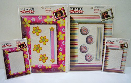 Contents : (1) Flower Pattern Frame w/ 5 Accent Pieces for 4"x6" Photos & Art / (1) Stripe Pattern Frame w/ 5 Accent Pieces for 4"x6" Photos & Art / (1) Flower Frame for 2"x3" Photos & Art / (1) Stripe Frame for 2"x3" Photos & Art