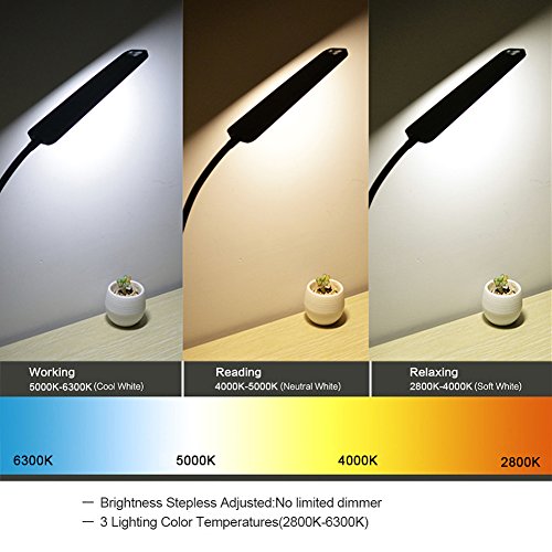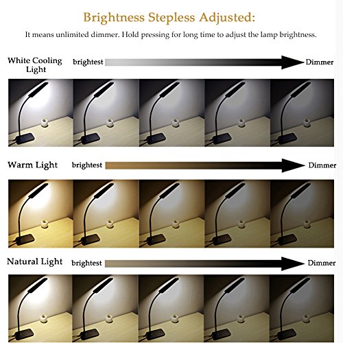 3.Brightness Stepless Adjusted: it means unlimited dimmer. Hold pressing for long time to adjust the lamp brightness. Brightest Reading Lamp: there are 57 led bulbs. It emits enough light forCollege Student Study, office working or bedside reading.