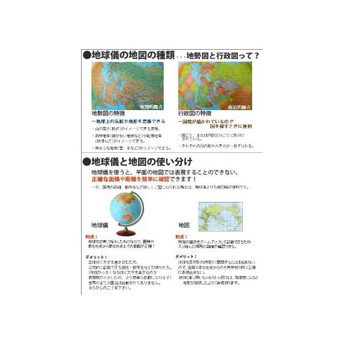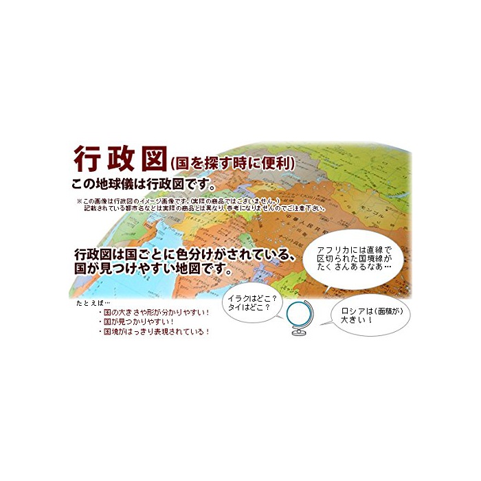 ■규격:행정도 지구의에는 행정도와 지세도가 있고, 행정도는 나라마다 색별 분류 된 지도 입니다.세계의 여러 나라의 크기나 국경이 알기 쉽게 그려져 있으므로,아드님의 학습으로도 적합입니다.