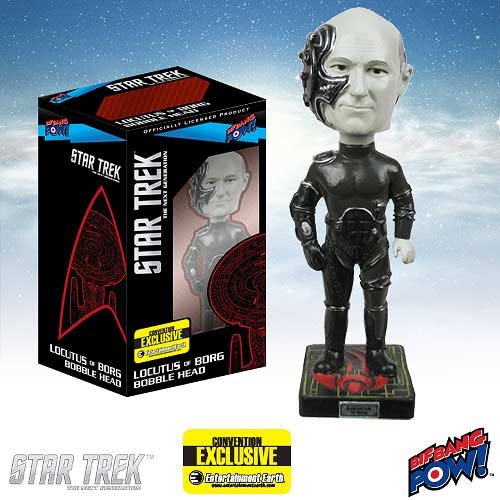 -. Feature : Captain Picard is a Borg? That datum is a bit hard to assimilate! The captured and assimilated Jean-Luc Picard appears as Locutus! / Exclusive bobble head from the 'Best of Both Worlds' episode of The Next Generation. On a Star Trek / Borg logo base, he's ready to do the hive's bidding! Entertainment Earth Convention Exclusive! / Say it isn't so! From the surP.R.Ising two-part 'Best of Both Worlds' episode of Star Trek: The Next Generation, a captured and assimilated Captain Jean-Luc Picard appears as Locutus in this 7-inch scale Star Trek Locutus Bobble Head, a Convention Exclusive from Bif Bang Pow! . Why do you resist? / He only wishes to raise quality of life for all species. Order now! Locutus is here to change your galaxy - and you - in this cybernetic altered take on Captain Picard. / Loaded with cables, wires, machines, and the nanoprobes that changed him from the hardworking hero of Starfleet into a pawn of the Borg Collective, this amazing resin bobble head stands approximately 7-inches tall on a Star Trek / Borg logo base, ready to do the hive's bidding. So, don't let him get too close to you! Ages 14 and up. One of the largest cult phenomena of our time, Star Trek is a science-fiction entertainment franchise based on a fictional universe created by Gene Roddenberry.