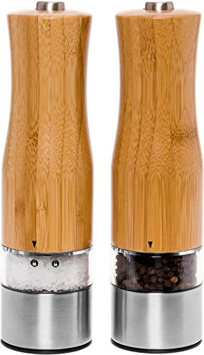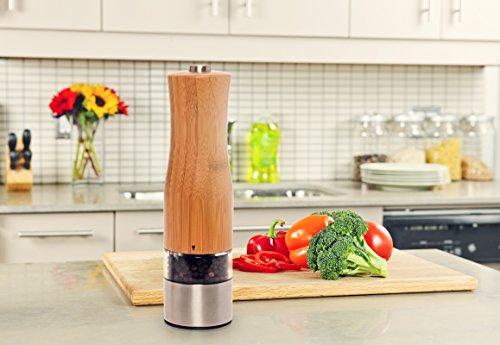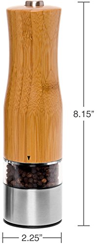 Electric Salt and Pepper Grinder Set - 2 Pack Battery Operated Automatic Pepper Shaker Mills w/ LED Light and Adjustable Coarseness by Mindful Design (Bamboo)