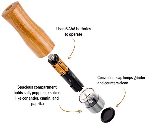MAKES GRINDING FRESH SPICES EASY - The simple one-touch operation makes grinding all manner of spices a quick and efficient affair. Just push the top button, and the battery operated grinder turns on, dispensing the perfect amount of salt or pepper. A convenient LED light on the bottom lights up automatically, providing the perfect amount of illumination to prevent over-seasoning.