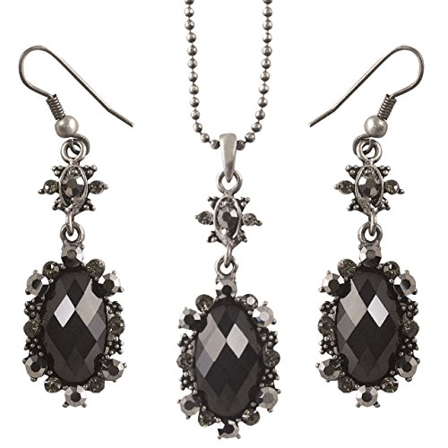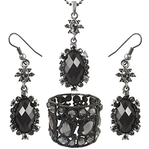 -. Binding : Jewelry -. Brand : Crystal Elegance UK -. Department : womens -. Feature : Exceptional price and quality. / Beautiful elegant flower design black crystal drop set - 40cm chain, 4cm pendant drop, 4 cm earring drops. / Rhodium plated encrusted with black opaque oval crystal central piece. Comes with crystal faced stretch barcelet 5cm wide. / Comes with matching black earrings that measure 4cm length drop down length / Extremely light and comfortable to wear - gift boxed. -. Label : Crystal Elegance UK -. Manufacturer : Crystal Elegance UK -. Model : spblackset1386 -. MPN : spblackset1386 -. PartNumber : spblackset1386 -. ProductGroup : Jewelry -. ProductTypeName : FASHIONNECKLACEBRACELETANKLET -. Publisher : Crystal Elegance UK -. Studio : Crystal Elegance UK -. Title : Elegant Black Retro / Gothic Design Crystal Drop Necklace Earrings Bracelet Set for Her