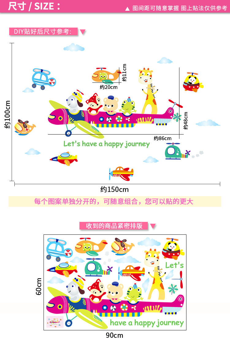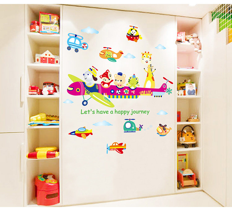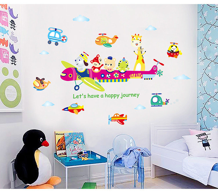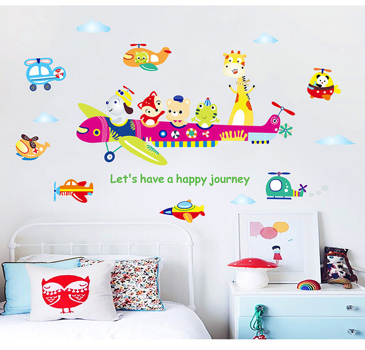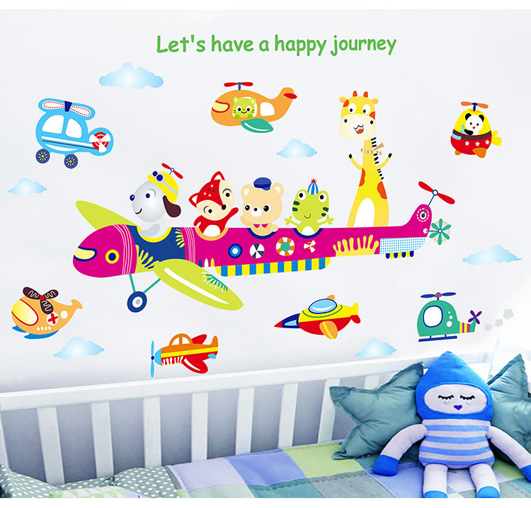 儿童房间装饰幼儿园墙面墙纸自粘贴画宝宝卧室卡通动物飞机墙贴纸