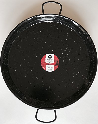 Studio : Vaello Campos Publisher : Vaello Campos Binding : Kitchen Product Description This is a professional quality pan made in Valencia by Vaello Campos S.L, Spain's premier manufacturer of Paella pans. A 55cm pan will serve 6 to 7 people as a main course or 9 to 11 people as a tapas portion. These portion sizes are based on the size of a standard British dinner plate. The manufacturer, and the label in the middle of the pan will tell you it will feed a few more but in our experience this is never the case. These Vaello pans are used in homes and restaurants across Spain to produce the nations favourite dish. Manufactured from enamelled carbon steel the pans are very well made and durable. The large cooking surface allows an even distribution of heat across the pan to give perfect cooking results every time letting the rice cook evenly to maximise the flavour. The flared sides of the pan encourage the quick evaporation of liquid and the enamelled steel prevents the rice from sticking to the base of the pan while cooking. They can be used on hobs (gas electric and 0