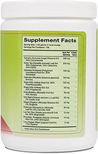 -. Feature : High potency formula featuring turmeric, resveratrol, and green tea / Modulates inflammatory response function / Provides antioxidant activity / Sested Use: 1 level scoop (1 gram) as directed by your healthcare practitioner. Mix in tea, juice, or a smoothie. / DOES NOT CONTAIN: Wheat, gluten, soy, milk, eggs, fish, crustacean shellfish, tree nuts, peanuts