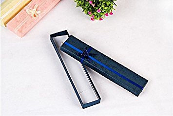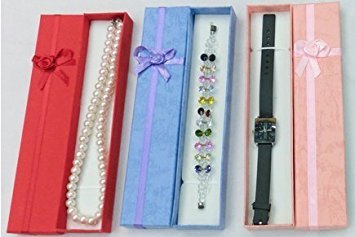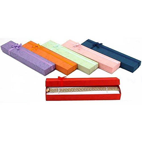 -. Feature : Each box measures 7.8" X 1.6" X 0.8" and comes in a bundle of 4 boxes. Boxes come in an assortment of colors and cannot be color specified. / Each box comes with a removable white velvet cushion or satin material made for specific jewelry pieces including earrings, bracelets, necklaces, etc. Ideal for crafts, party favors, jewelry, gifts and much more. / Package your jewelry, gifts and other items in style with these assorted boxes made of high-quality chipboard and covered in decorative, textured paper. The boxes feature a matching satin ribbon and bow with a rose conveniently attached to the box - no need to wrap or decorate because we've done it for you. / Each box lid is covered with a bow tie that matches the color of the box The insert inside has two elastic bands to keep your jewelry in place