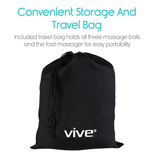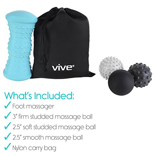 Hot/Cold Therapy Massage Ball Set by Vive Providing safe and effective hot or cold therapy, the Vive massage ball set relieves inflammation and sore muscles, reduces tension and increases circulation, flexibility and mobility. Contains an ergonomically designed foot roller, two studded massage balls and a smooth lacrosse massage ball for targeted massage. Great to use with CrossFit, yoga and many other fitness programs. Effective Hot and Cold Therapy: Easily warm or cool the massage ball of your choice for effective massage. Alleviating inflammation and painful sore muscles, the set is also useful for relieving tension and increasing circulation and mobility. Great for using as a part of CrossFit, yoga or many other fitness programs. Also great for sensory therapy. Deep Tissue Massage and Myofascial Release: Perfect for self myofascial release, trigger point therapy and targeted deep tissue massage, the massage ball set can be warmed up in hot water prior to use, or be frozen overnight. Great addition to pre-work routines as well as post-works, effectively stretching and releasing tense muscles. All-Inclusive Five Piece Set: All-inclusive massage set contains a convenient carry bag, a foot roller, two studded massage balls and one smooth lacrosse massage ball. The textured foot roller provides relief from plantar fasciitis and heel spurs while reducing edema and fatigue. Providing an alternative to acupuncture, the two studded massage balls have different levels of firmness for effectively massaging painful trigger points. The smooth lacrosse massage ball is the perfect size for providing concentrated self-massage. Durable, Lightweight and Portable: Durable and lightweight, the composite massage balls and roller are split, crack and tear resistant. The set includes a carry bag for easy portability. Perfect for use at the gym, in the office, or on the go. What's Incl 0