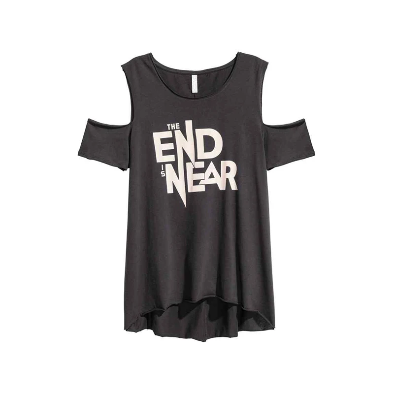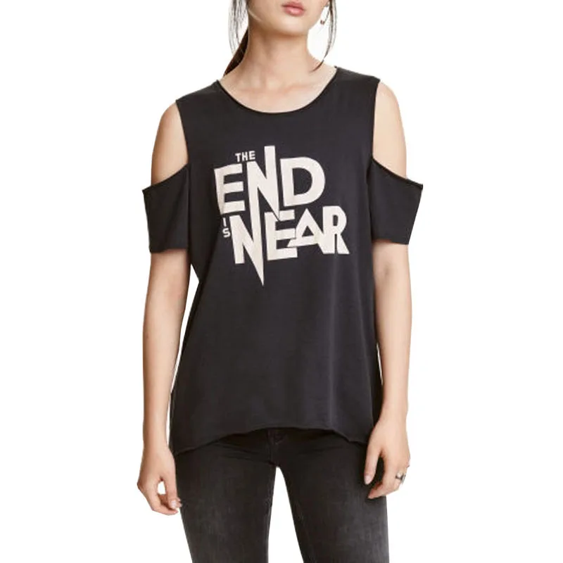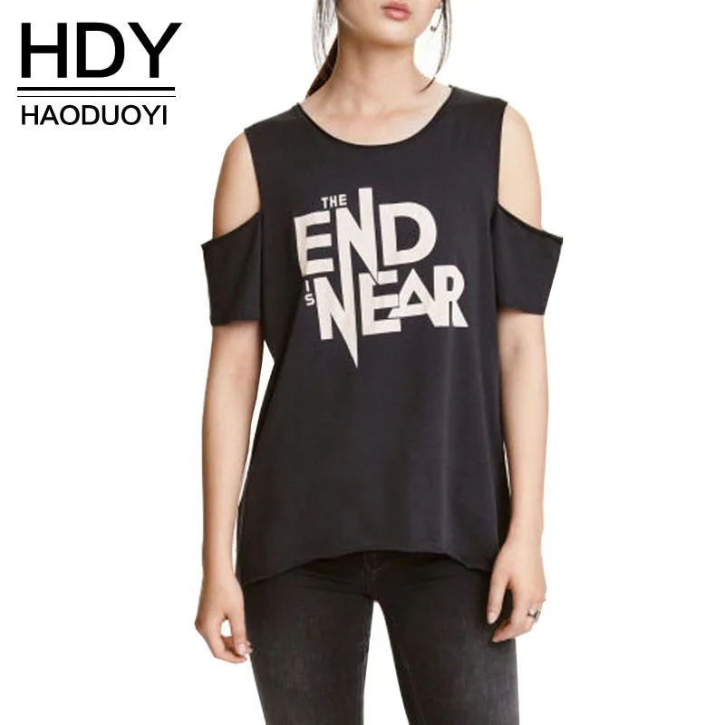 HDY Haoduoyi Solid Black Women Street Casual T-shirt Sexy Cold Shoulder Letter Print Tops Natural Crew Neck Cotton Basic Tees | |||||||||||||||||||||||||||||||||||||||