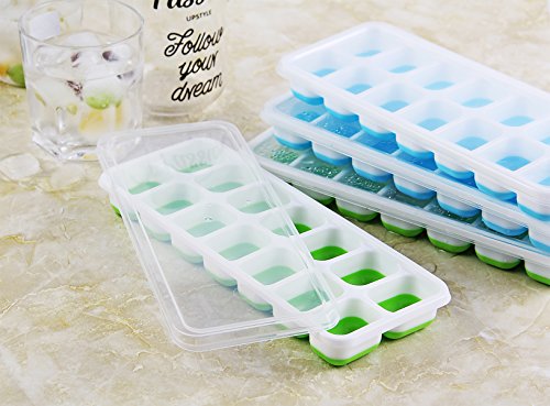 Sikves Ice Cube Trays with No-Spill Lid, BPA Free Silicone Ice Cube Marker Molds Easy to Pop Out, Perfect for Water, Cocktail and Drink, Set of 4 (Green&Blue)