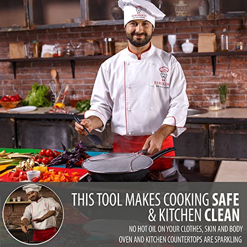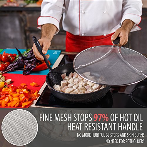 Stops 97% of splash and keeps kitchen clean: Made of 304 grade stainless steel and extra fine mesh, BergKoch splatter guard lid lets all the steam out and allows you to watch the cooking process easily. Resing feet keep grease off your counters. Securely joined plastic handle protects your hands from painful burns.