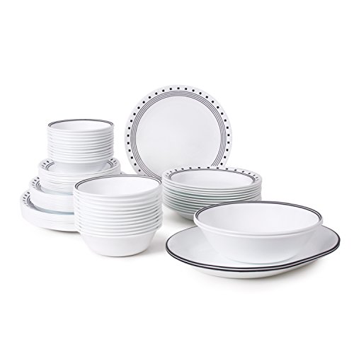 CORELLE Livingware. The original break and chip resistant glass dinnerware. Trust that it can stand up to the rigors of everyday life and still look great. 3 year replacement warranty against breaking and chipping! 76-pc set includes 12 each: 10-1/4" Dinner Plates, 8-1/2" Salad/Luncheon Plates, 6-3/4" Bread & Butter Plates, 18-oz Soup/Cereal Bowls, 15-oz Rimmed Soup/Salad Bowls, 10-oz Dessert Bowls, 2 each: 12-1/4" Platters, 1-qt Serving Bowls. Functional and versatile, our Winter Frost White collection is a fundamental basic, perfect in its simplicity and pure in its form.Feature